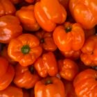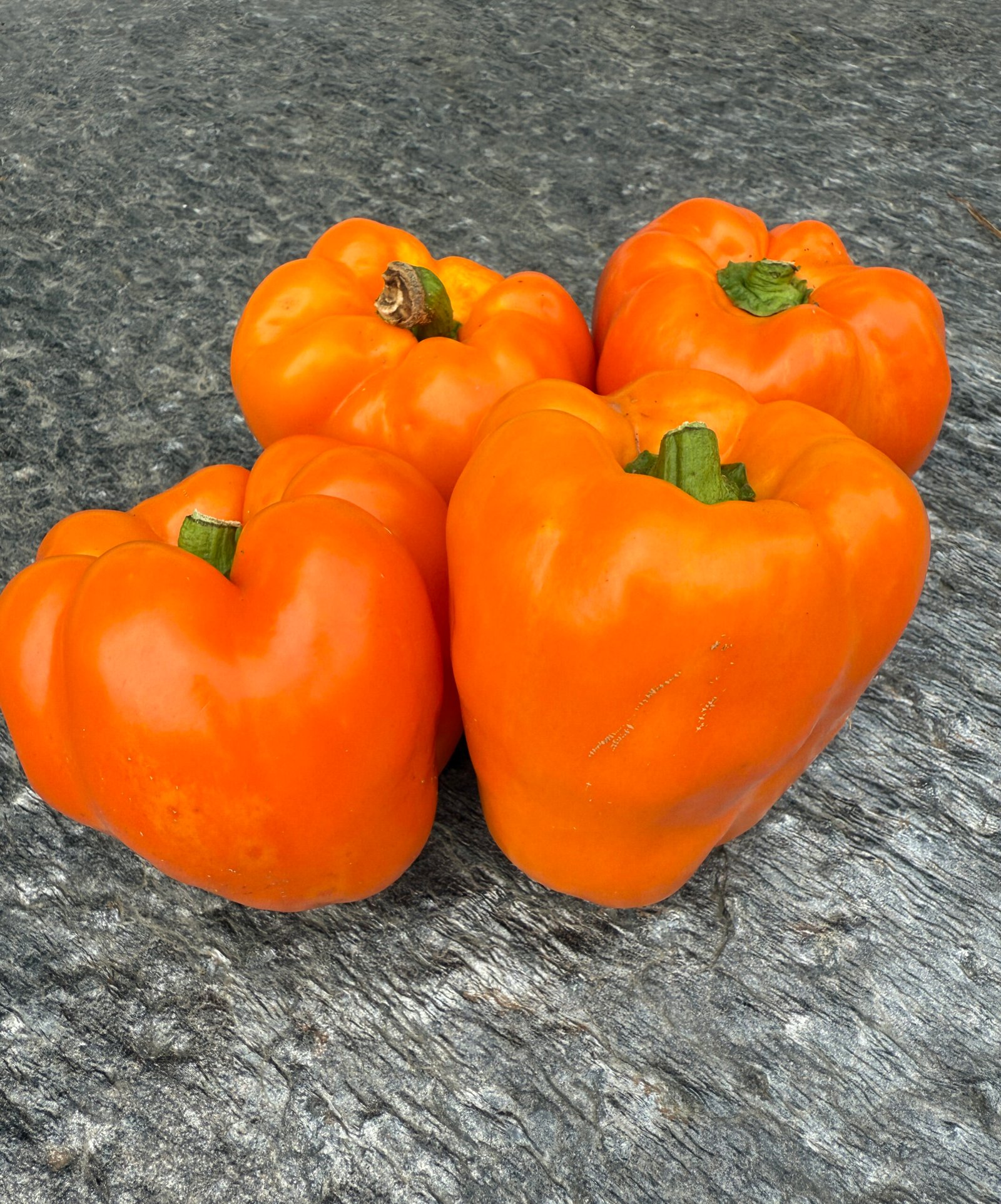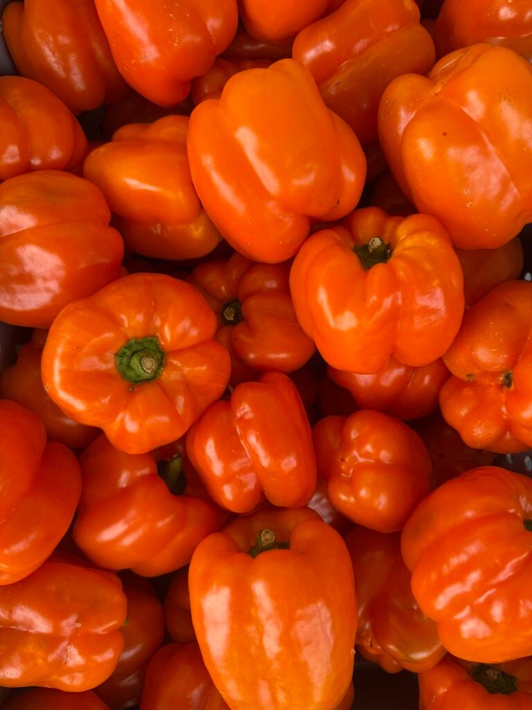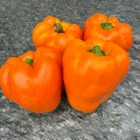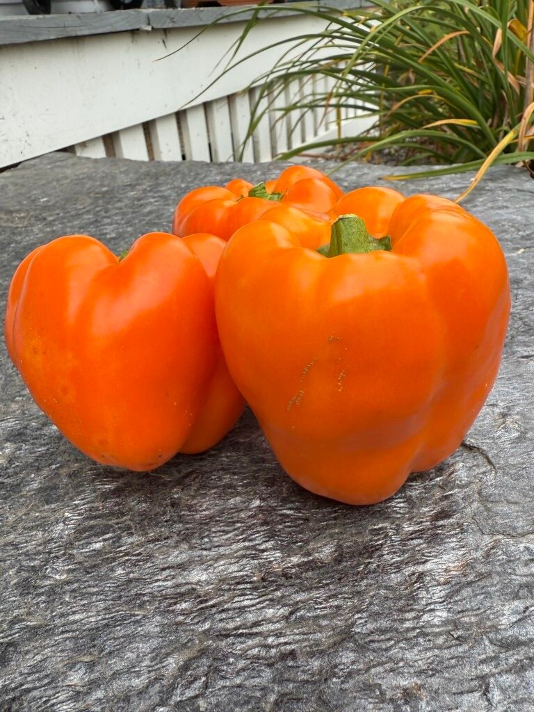 This orange bell pepper has heavy, thick walls and a wonderfully sweet flavor. Probably the best tasting open pollinated orange bell pepper I’ve had. It is a Swiss variety that matures quickly and produces 6–12 large sized fruits per plant. Very tasty as a green pepper too. Seed stock shared by John Austin.