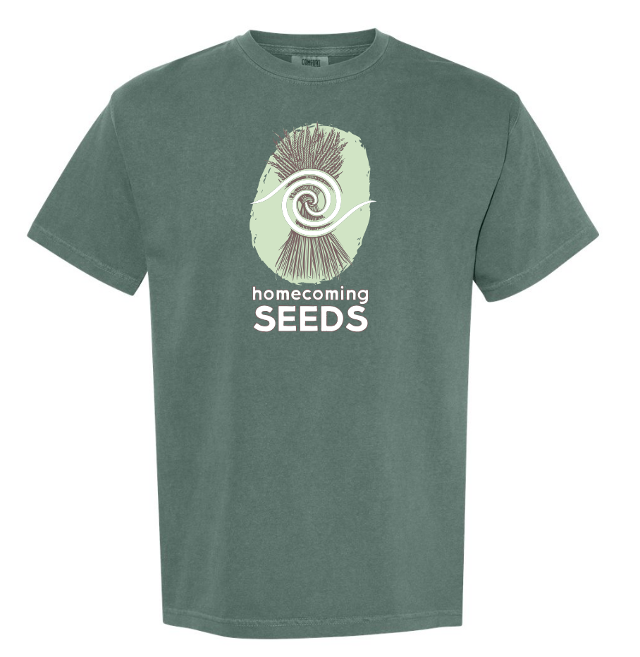 Green T-shirt with Homecoming Seeds logo designed by Marek Zajac and printed at New Duds in Colchester, VT. 100% cotton
