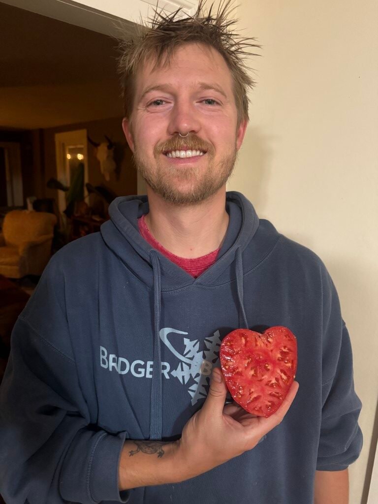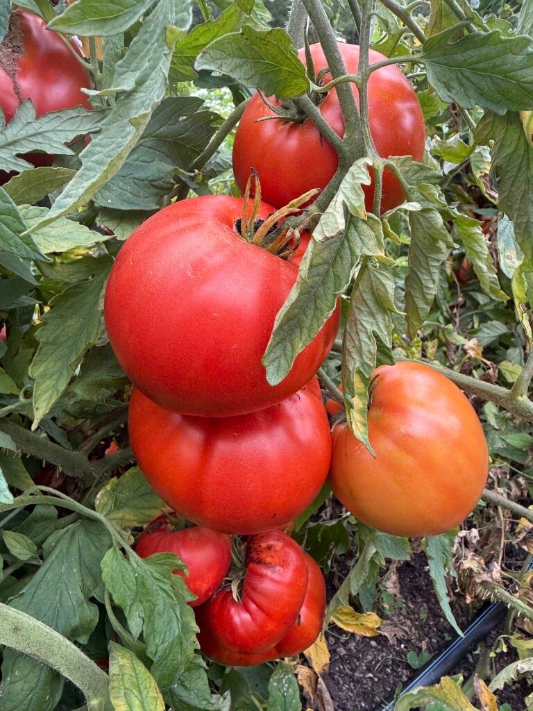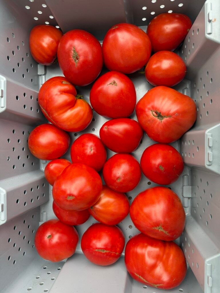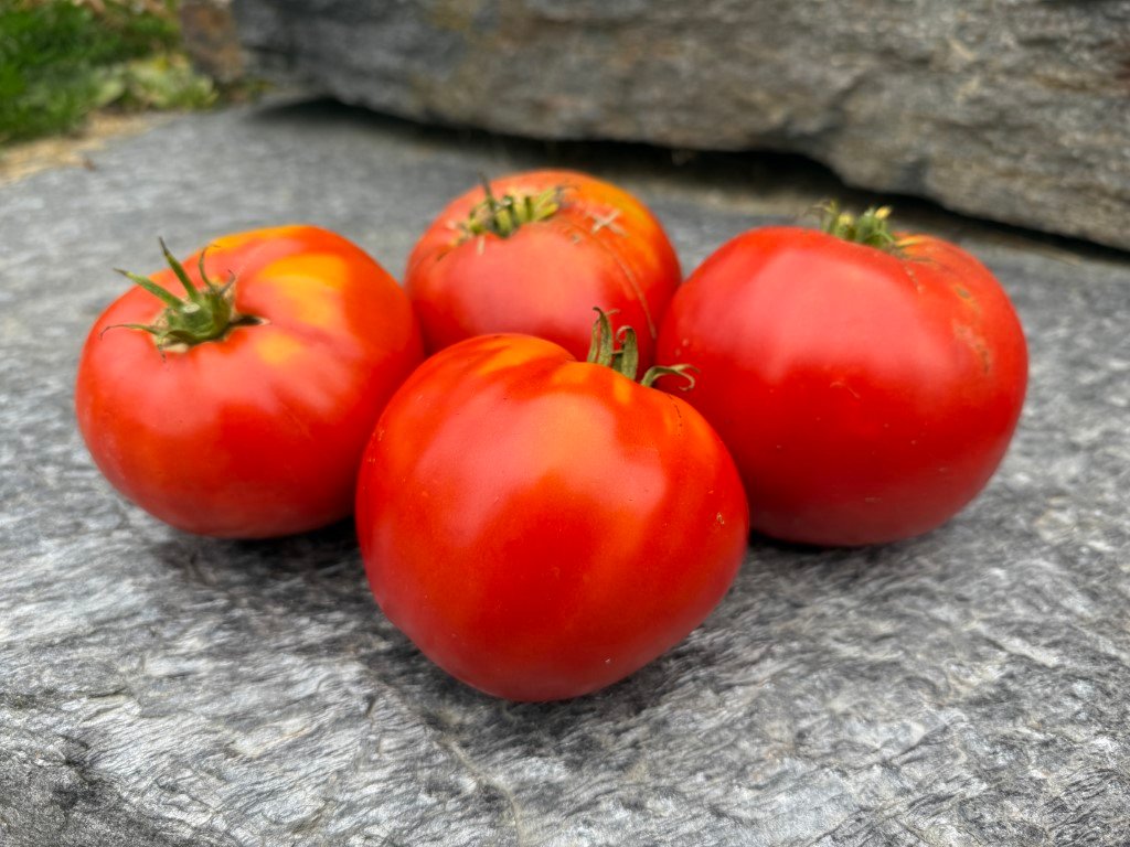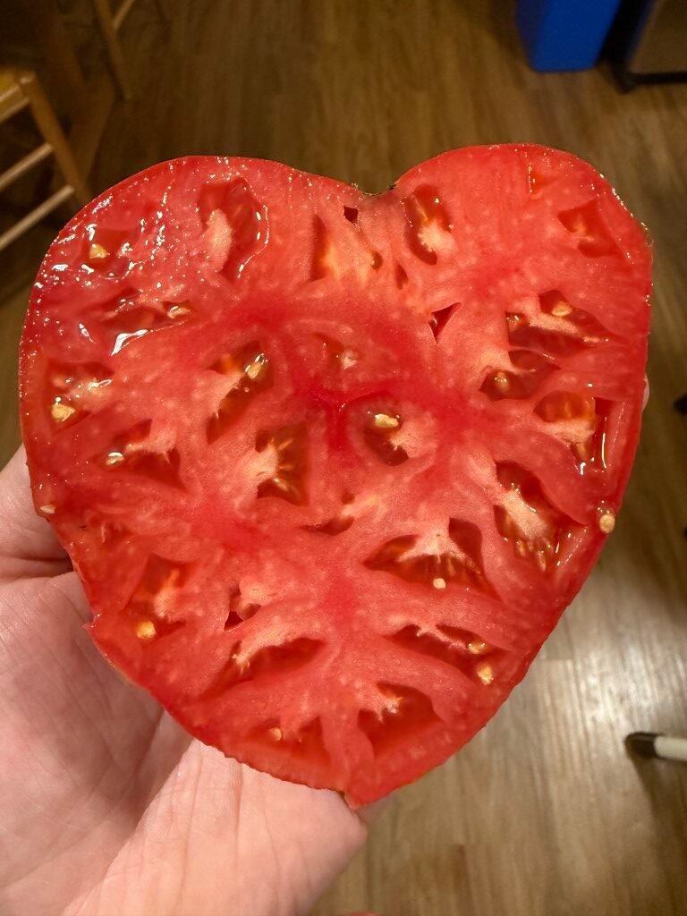 A wonderful, fast-maturing, large, meaty tomato with excellent flavor. The deep red flesh is dense and offers a classic, rich tomato taste, making it ideal for fresh consumption, sandwiches, sauces, and cooking. As an indeterminate variety, it produces vigorous, sprawling vines that require staking or strong caging for support. Due to its size and growth habit, ample space and consistent care are recommended to achieve optimal production. This variety was introduced to the Seed Savers Exchange in 2007 by Jeannine-Marie St. Jacques of Ontario, Canada, who obtained the seeds from Maria Amazilitei of Romania, after whom the tomato is named. All you need is one thick slice of this tomato for your BLT as its size covers the entire slice of bread and then some. We’ve gotten close to 2 pounders but they are reliable heavy producers of 1 lb + fruits. Seed stock shared by John Austin.